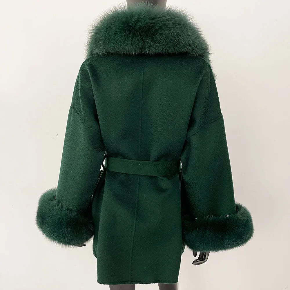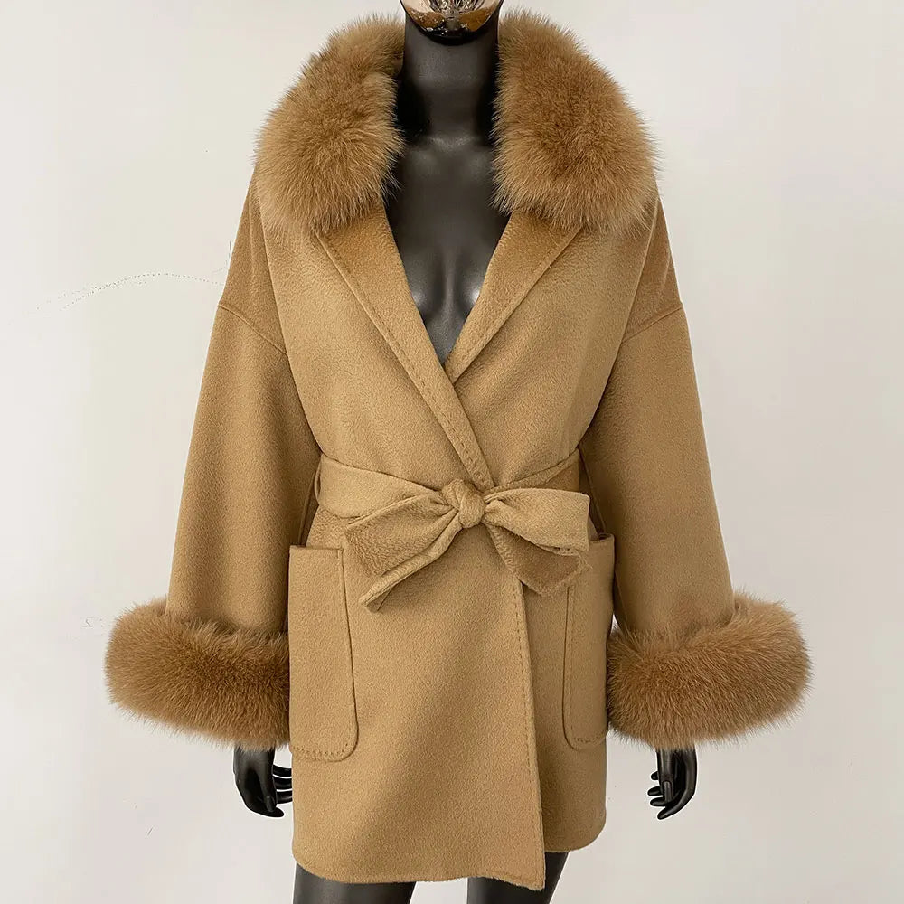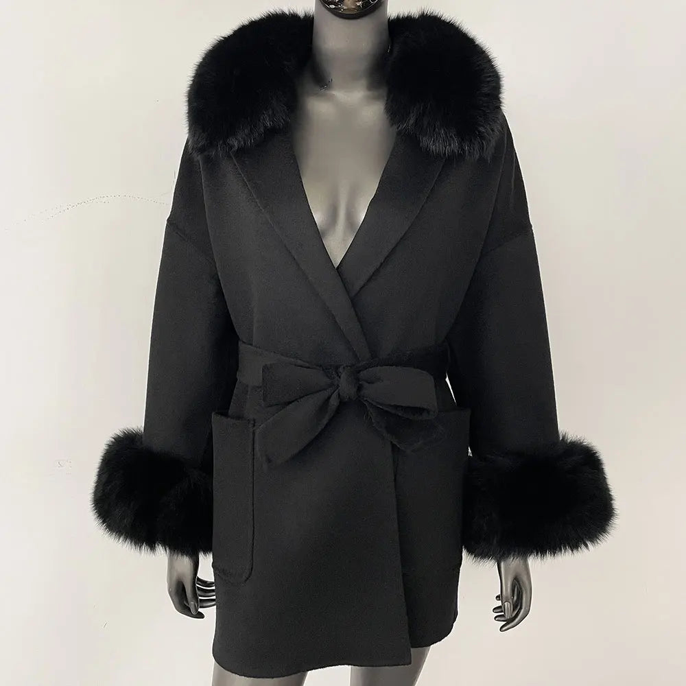 Made from a high-quality blend of fur and wool, this coat ensures maximum warmth and comfort while offering an elegant, polished look. The fur decoration adds an extra layer of luxury, making it a standout piece in any wardrobe.
